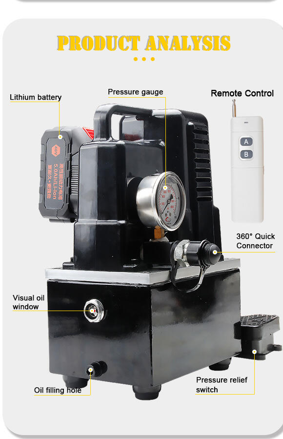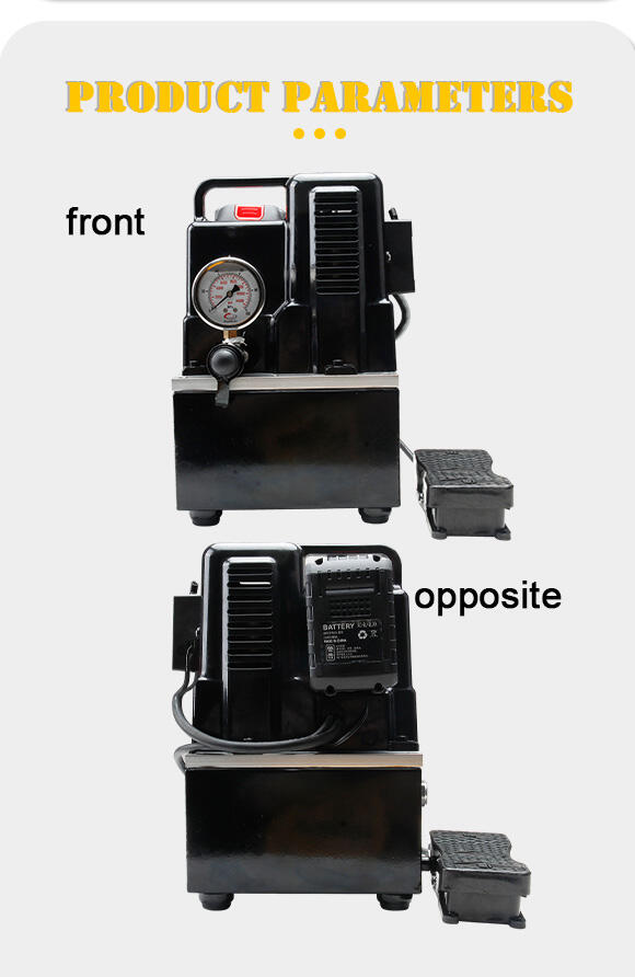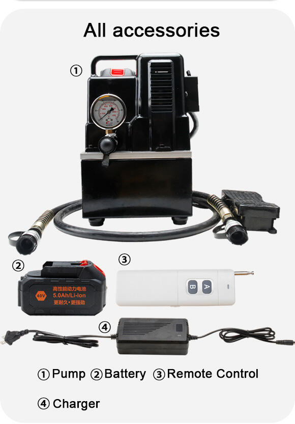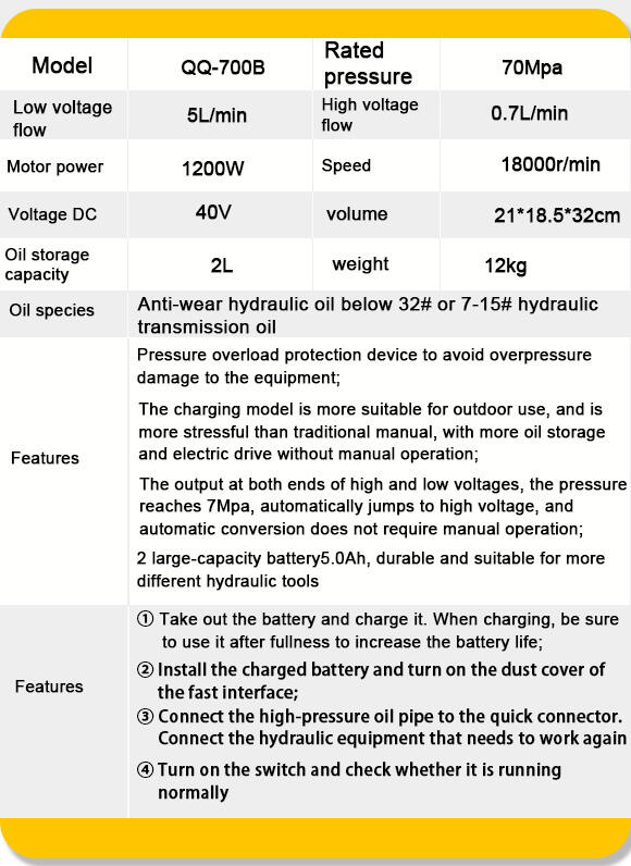 Устройство за защита от претоварване на налягането, за да се избегне повреда от прекомерно налягане на оборудването; Моделът за зареждане е по-подходящ за употреба на открито и е по-издръжлив в сравнение с традиционния ръчен метод, с по-голям капацитет за съхранение на масло и електрически двигател, без необходимост от ръчна работа; Изходът на високо и ниско напрежение от двата края, налягането достига 7 Mpa, автоматично преминава към високо напрежение, автоматично преобразуване без необходимост от ръчна работа; 2 големи батерии с капацитет 5.0Ah, издръжливи и подходящи за повече хидравлични инструменти |