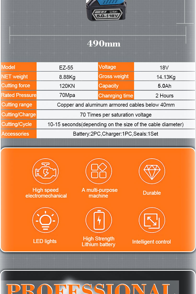 EZ-55 bateriový hydraulický nůž na kabely CU/AL