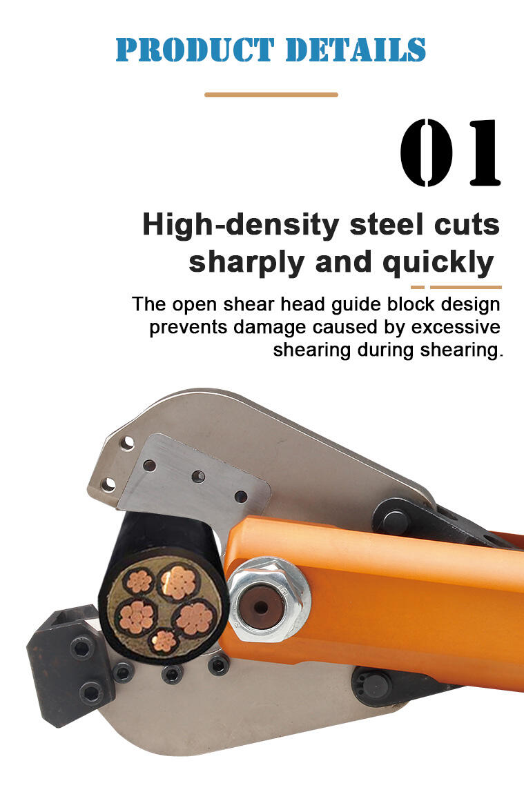 - Højdensitets stål skærer skarpt og hurtigt. Den åbne skærehovedføringsbloksdesign forhindrer skader forårsaget af overdreven skæring under skæring