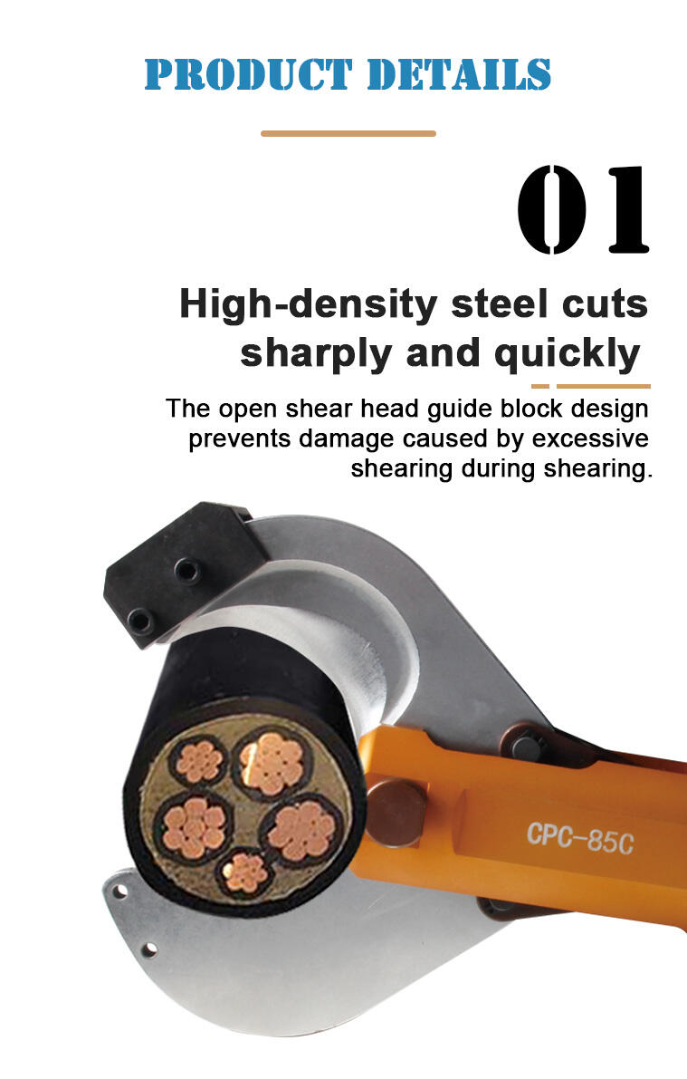 - Højdensitets stål skærer skarpt og hurtigt. Den åbne skærehovedføringsbloksdesign forhindrer skader forårsaget af overdreven skæring under skæring