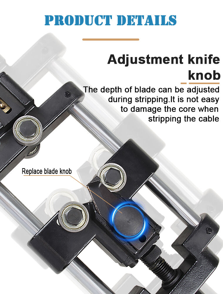 - Justeringsknapp for blad Dybden af bladet kan justeres under skræbning. Det skader ikke kernen, når kablet skræbes