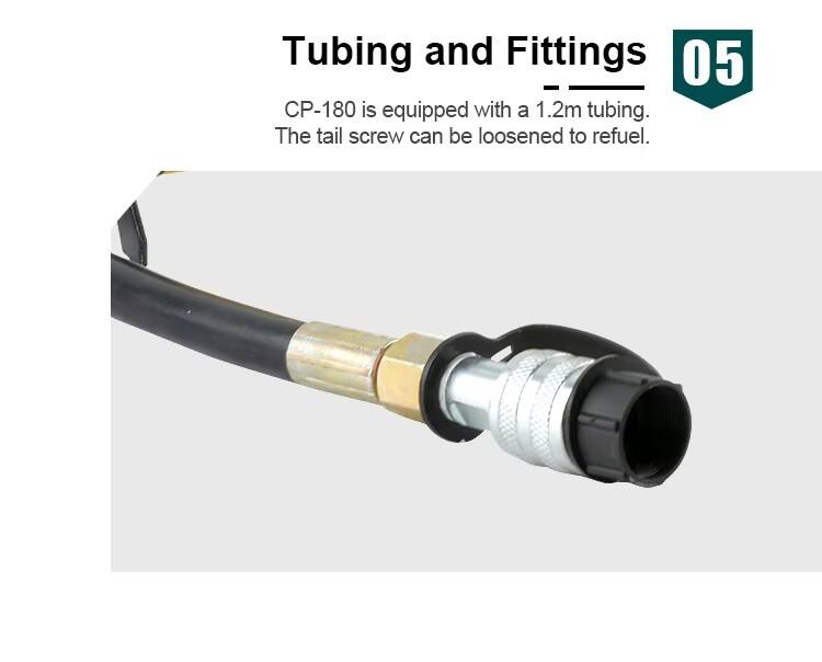 - Rørføringer og fittings - CP-180 er udstyret med en 1,2 m slange. Hale-skrue kan løsnes for at påfyld olie.