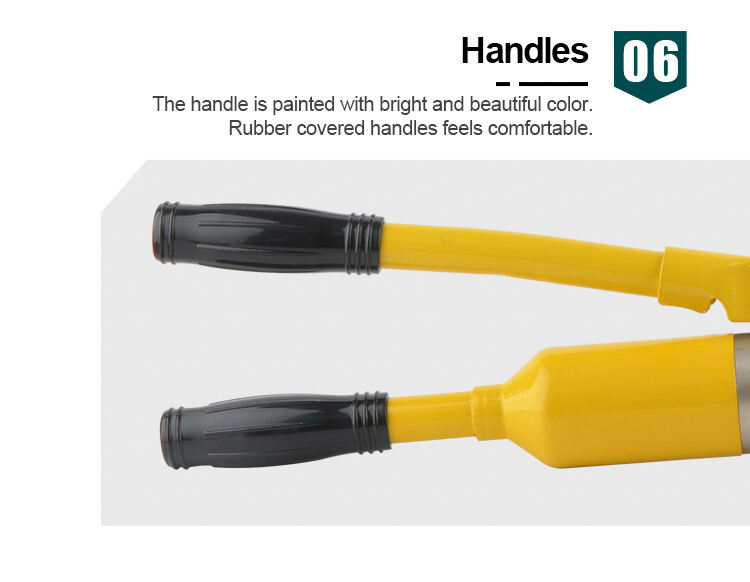 - Håndtag. Håndtaget er malet i klare og smukke farver. Gummibeklædte håndtag føles behagelige.