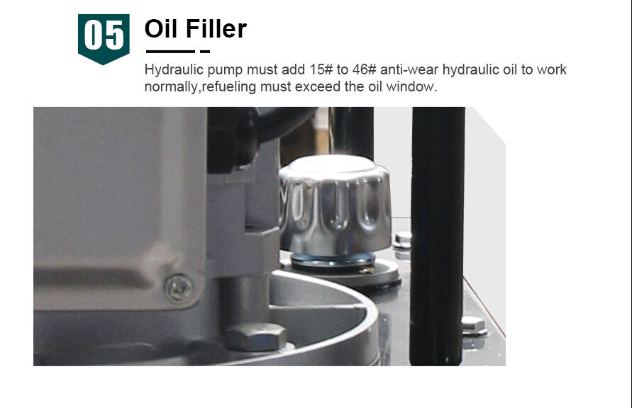 - Oliepåfyldning Hydraulikpumpe skal tilføje 15# til 46# slidstærk hydraulikolie for at fungere normalt. Oliepåfyldning skal overstige olietabet.