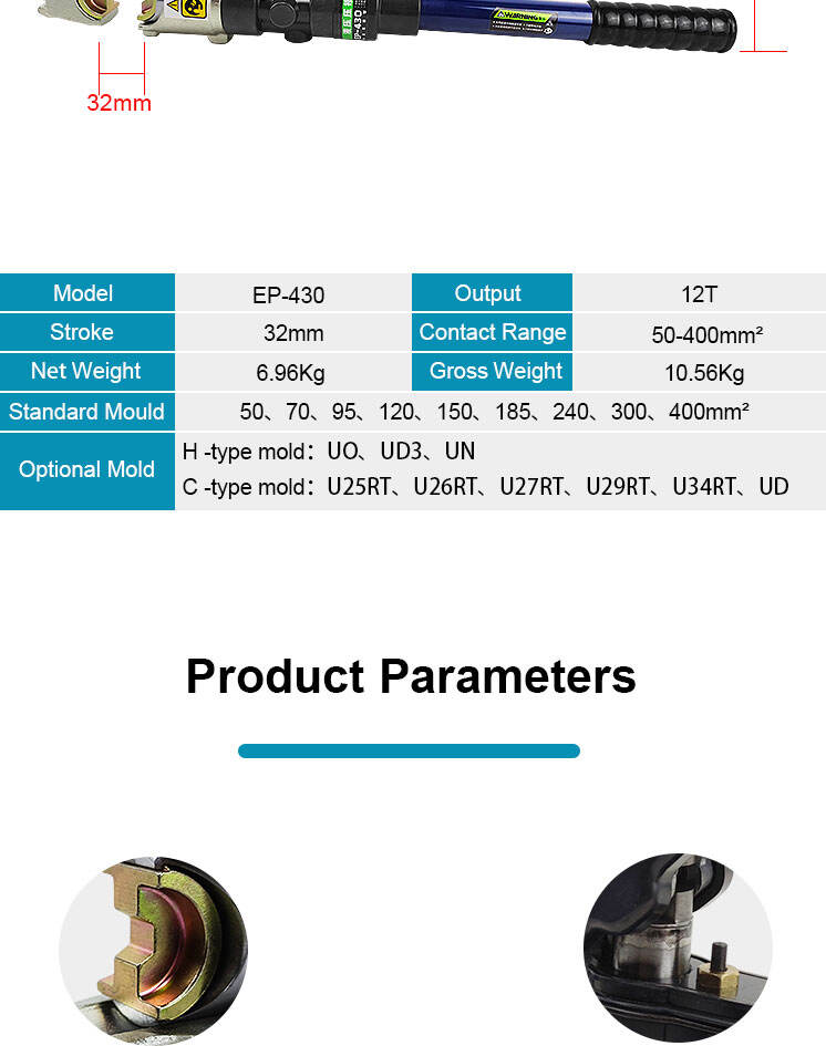 Hurtigsalg EP-430 manuel krimptang, krimper 50-400 mm² med sikkerhedsbælte, hydraulisk elektrisk kabelkonnektorkrimpværktøj