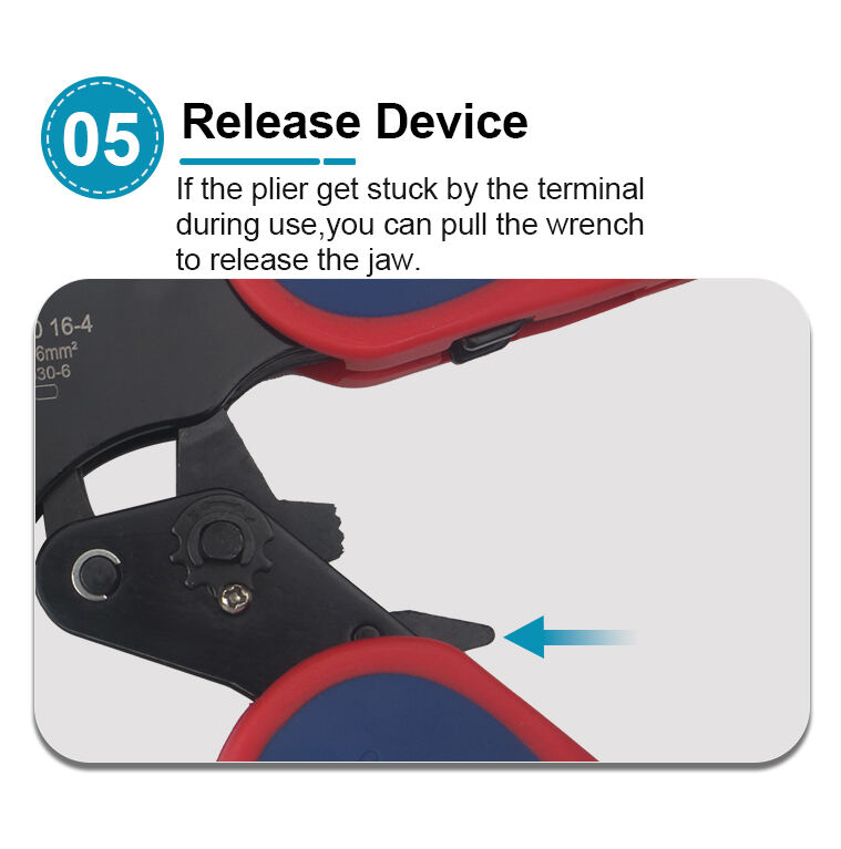 - Frislippesystem: Hvis tången sidder fast på grund af terminalen under brug, kan du trække skiftenøglen for at frigive kæften
