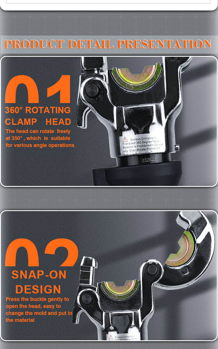 - 360° ROTERENDE KÆP Hovedet kan rotere frit 350°, hvilket er egnet til forskellige vinkleoperationer