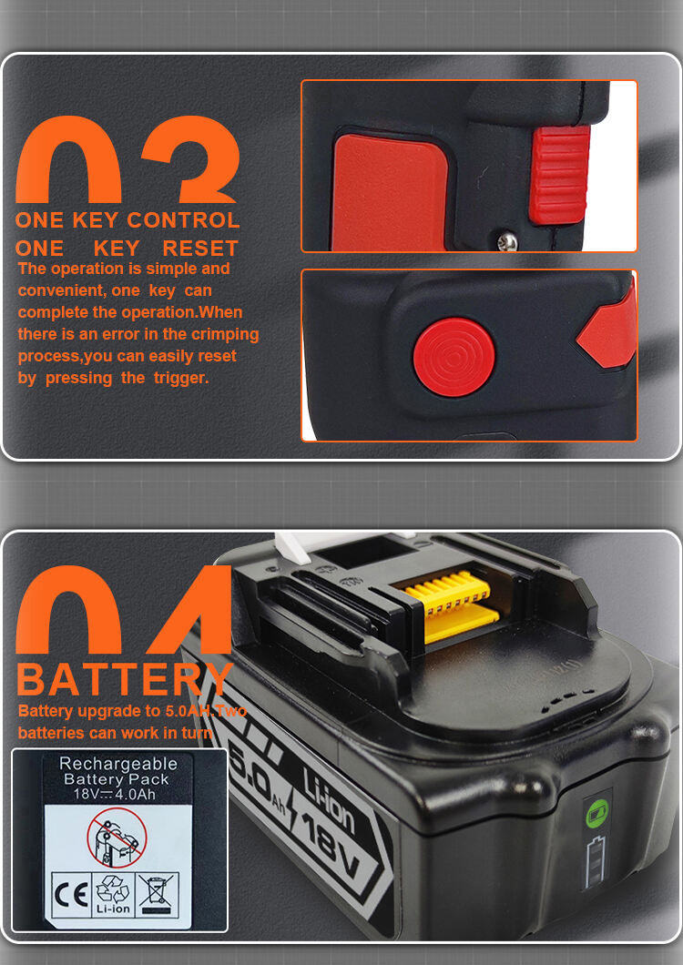 - EN-TASTS KONTROL EN-TASTS NULSTILLING Driften er simpel og praktisk, én tast kan udføre operationen. Når der er en fejl i presseprocessen, kan du nemt nulstille ved at trykke på aftrækkeren.