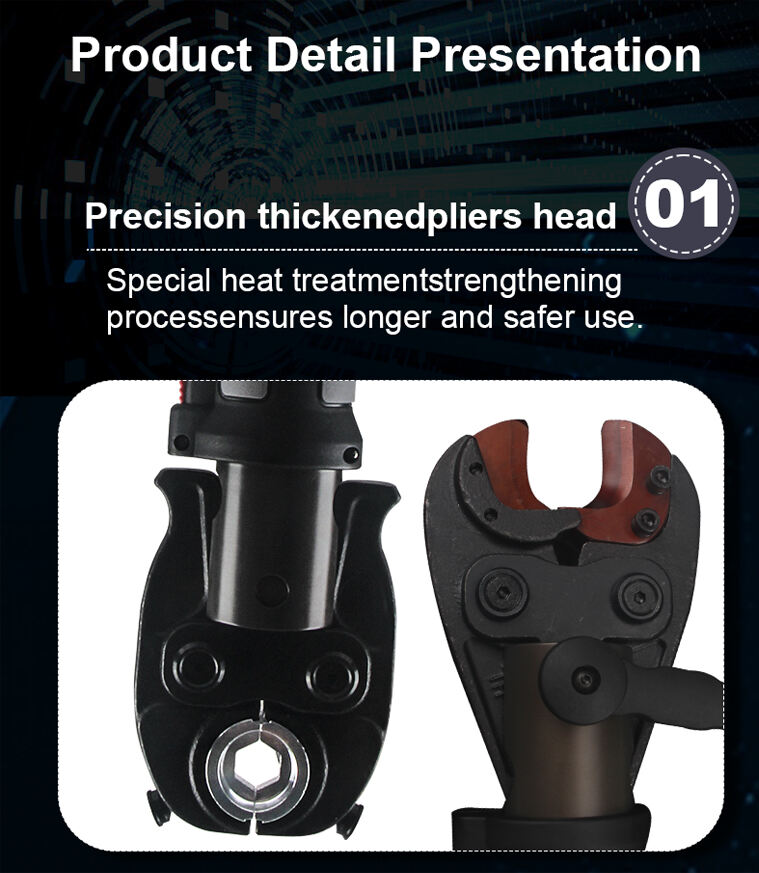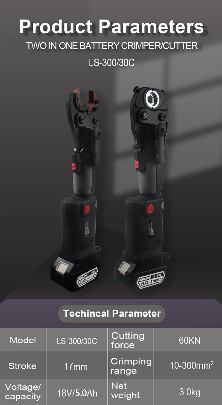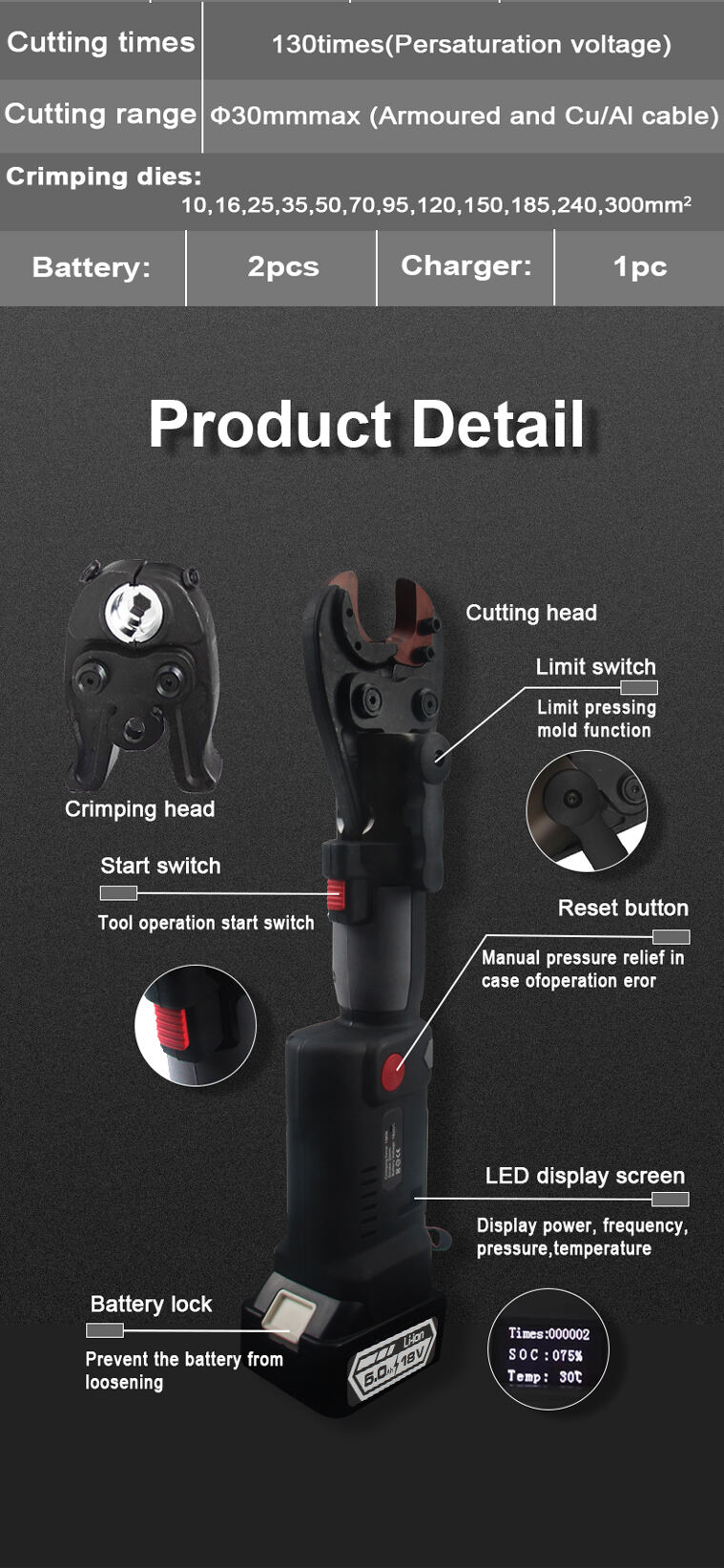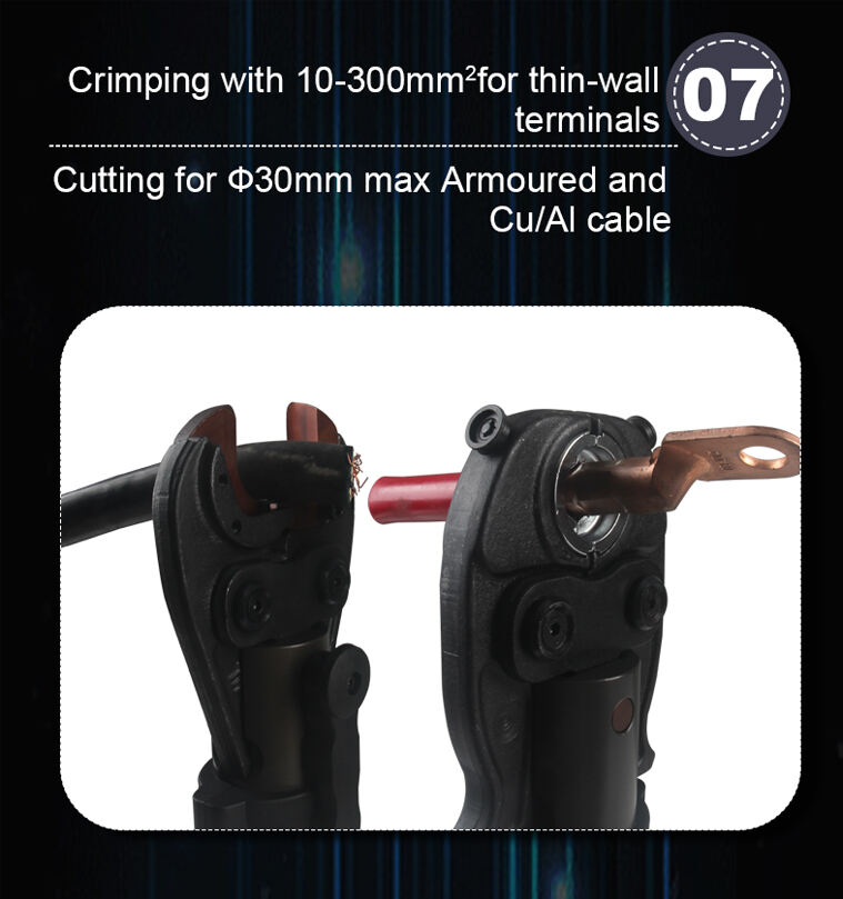 - Crimping med 10-300mm til tyndvæggede terminaler Skæring til Ф30mm maks Armeret og Cu/Al-kabel