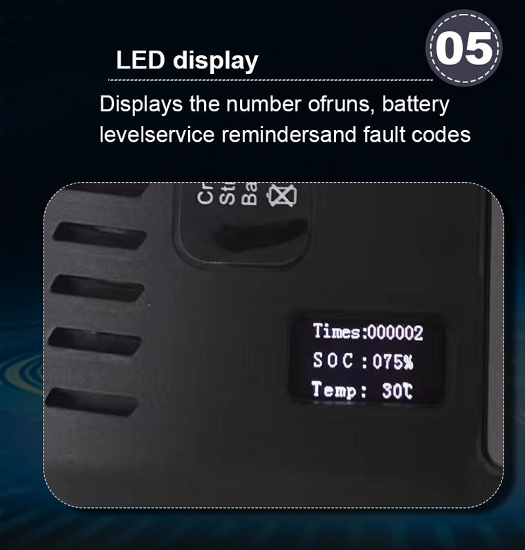 - LED-display Viser antallet af kørsler, batteriniveau, servicepåmindelser og fejlkode
