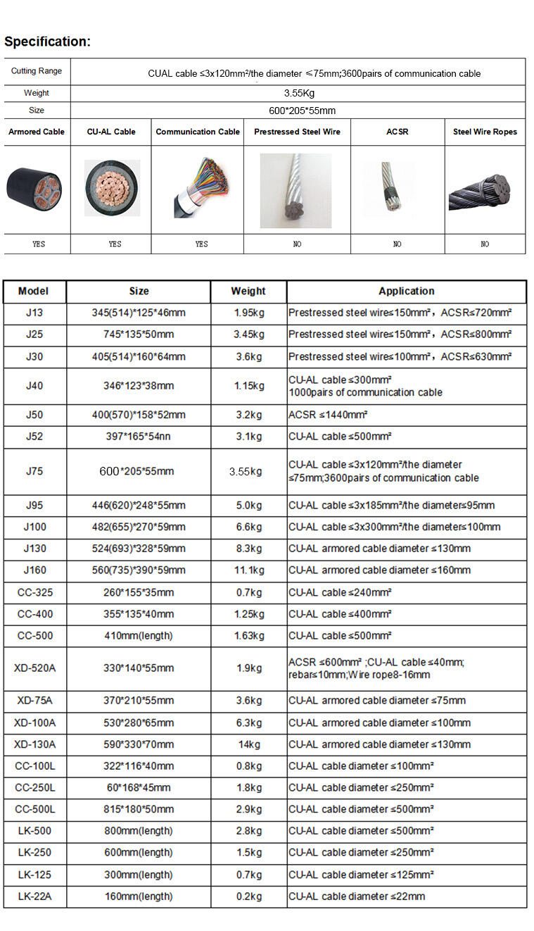 Skæreområde | CUAL kabel s3x120mm?/diameteren <75mm; 3600 par kommunikationskabel |