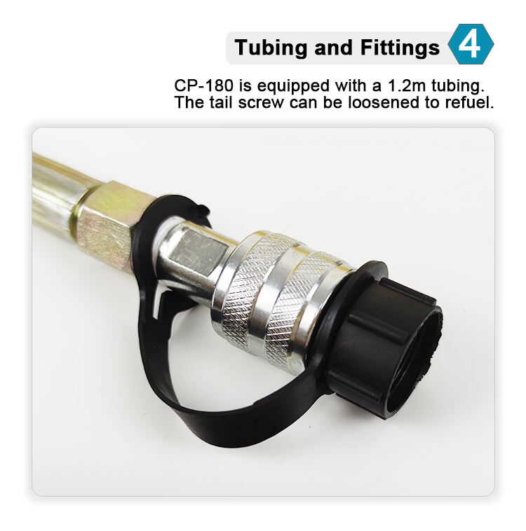 - Rørføringer og fittings - CP-180 er udstyret med en 1,2 m slange. Hale-skrue kan løsnes for at påfyld olie.