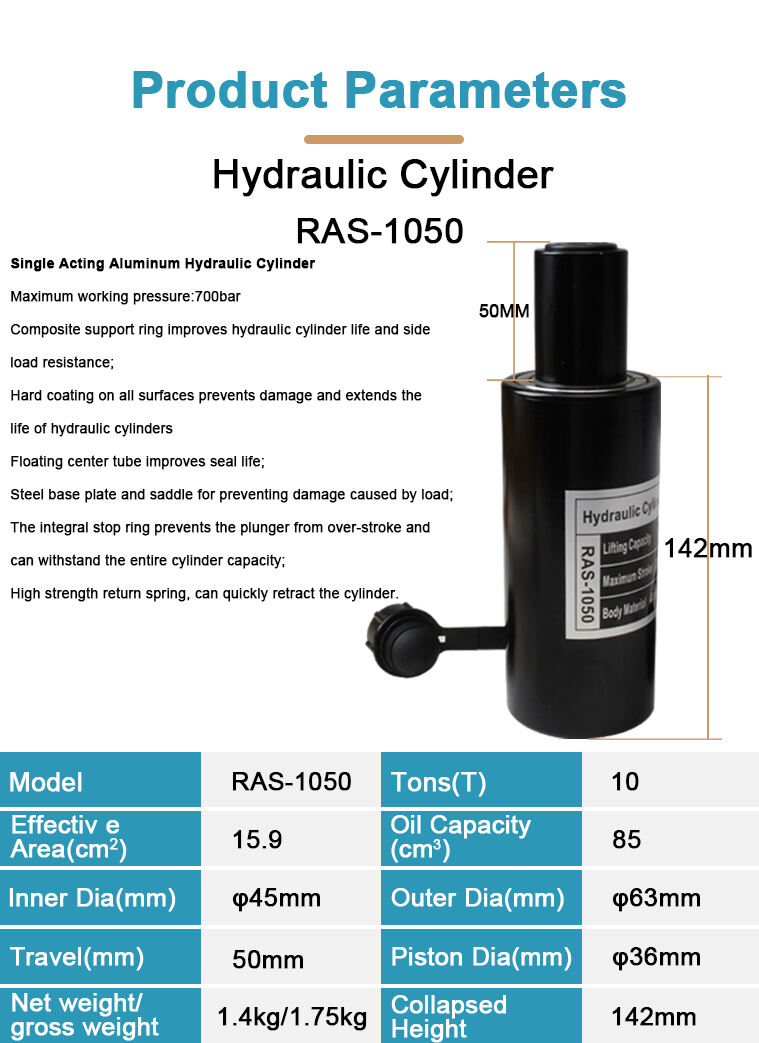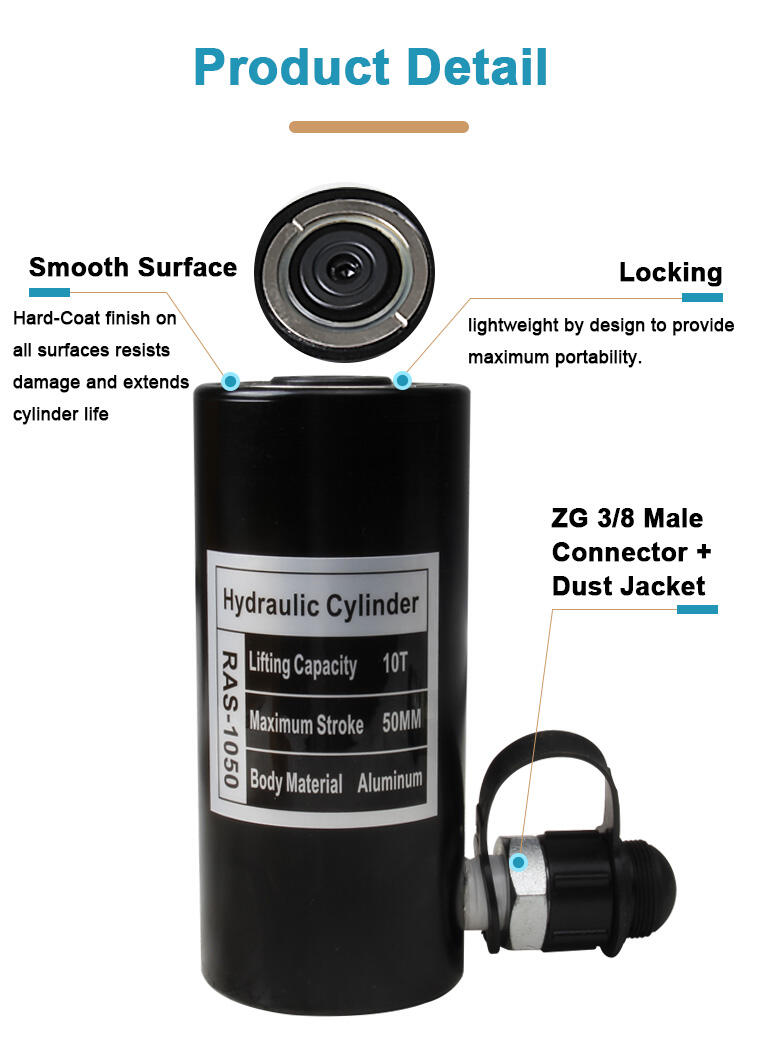 RAS-1050 Enkeltvirkende 10 Ton Aluminium Hydraulikcylinder Jack