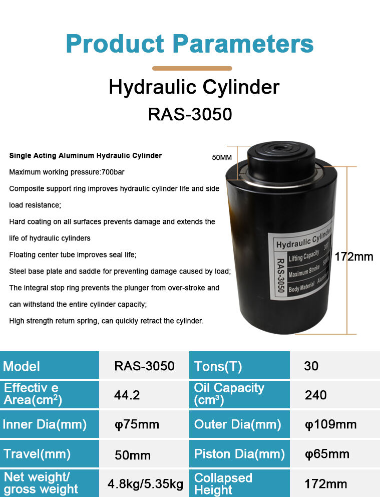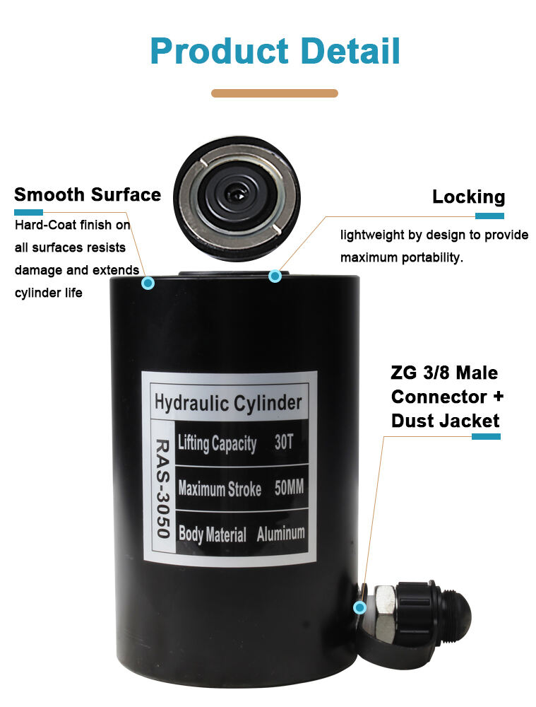 RAS-3050 enkeltvirkende 30ton letmetals hydraulisk spændingscylinder
