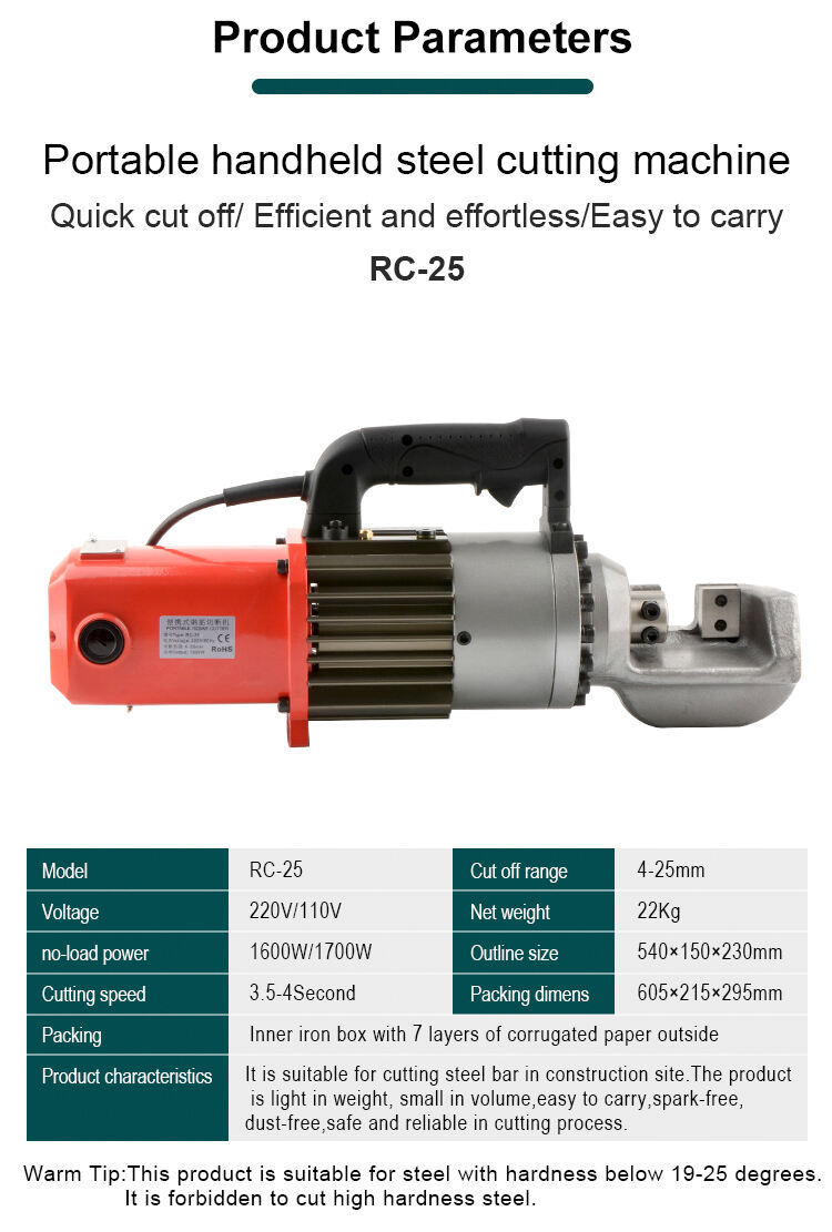 Den er egnet til at skære armeringsjern på byggepladsen. Produktet er let i vægt, lille i volumen, nemt at bære, gnistfri, støvfri, sikkert og pålideligt under skæring. |