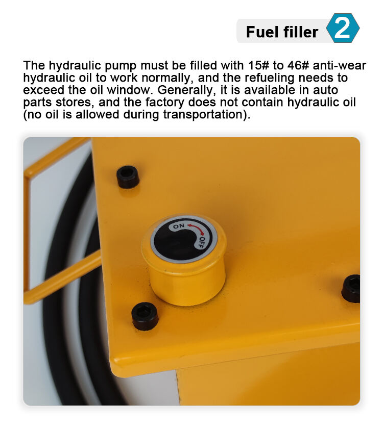 - Το υδραυλικό όργανο πρέπει να γεμίσει με ανθεκτικό στη φθορά υδραυλικό λάδι 15# έως 46# για να λειτουργεί κανονικά, και η πλήρωση πρέπει να ξεπερνά το παράθυρο του λαδιού. Συνήθως είναι διαθέσιμο σε καταστήματα ανταλλακτικών αυτοκινήτων, το εργοστάσιο δεν περιλαμβάνει υδραυλικό λάδι (δεν επιτρέπεται η μεταφορά χωρίς λάδι).