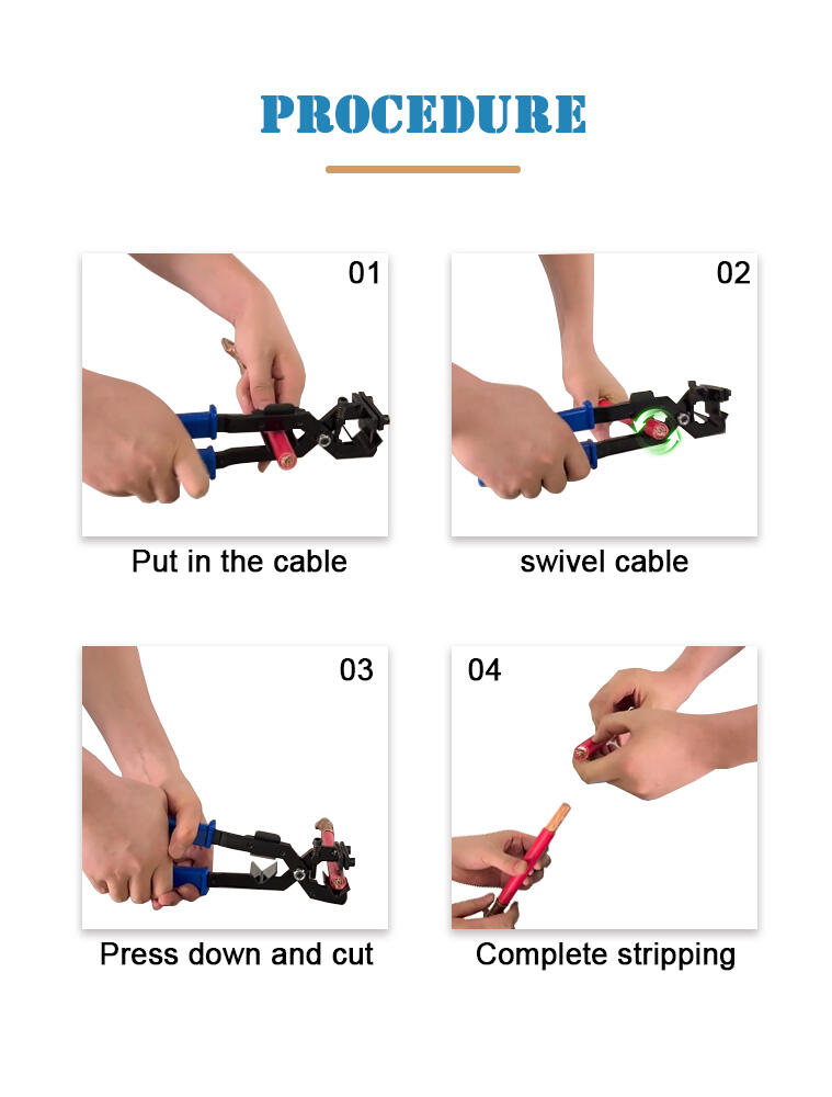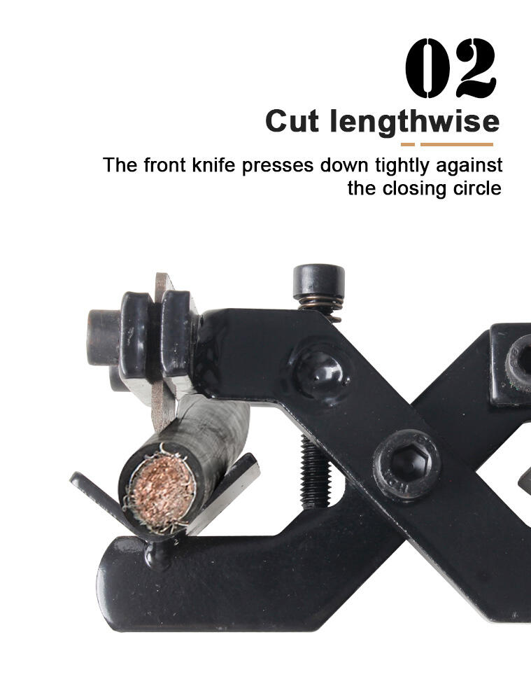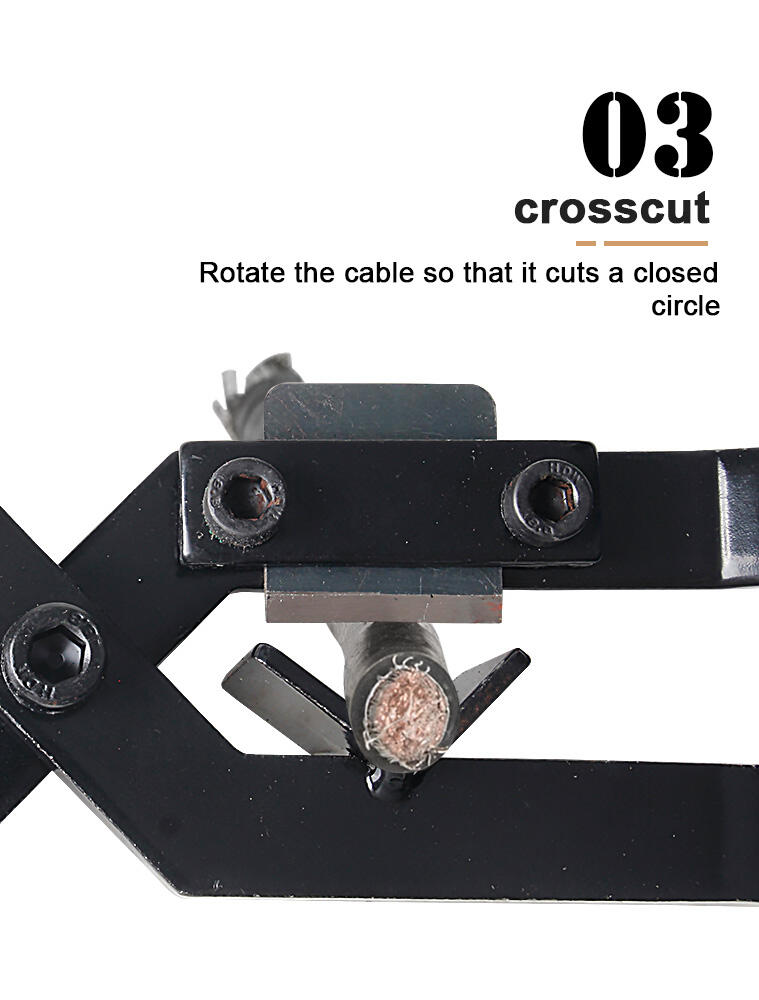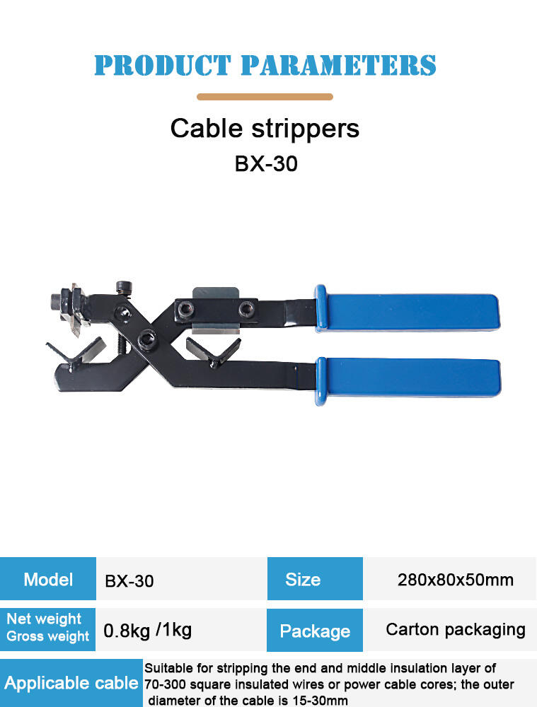 Câble applicable | Adapté pour dénuder les couches d'isolation centrale et terminale des câbles applicables, câbles électriques ou âmes de câbles isolés de 70 à 300 mm² ; le diamètre extérieur du câble est de 15 à 30 mm |