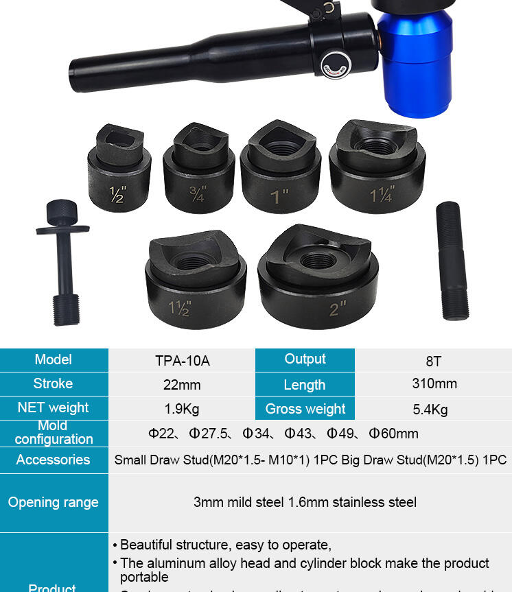 TPA-10A Hydraulic Knockout Hole Punch Driver Kit 1/2 to 2 Inch Electrical Conduit Hole Cutter Set Tool Kit Metal Sheet Punch